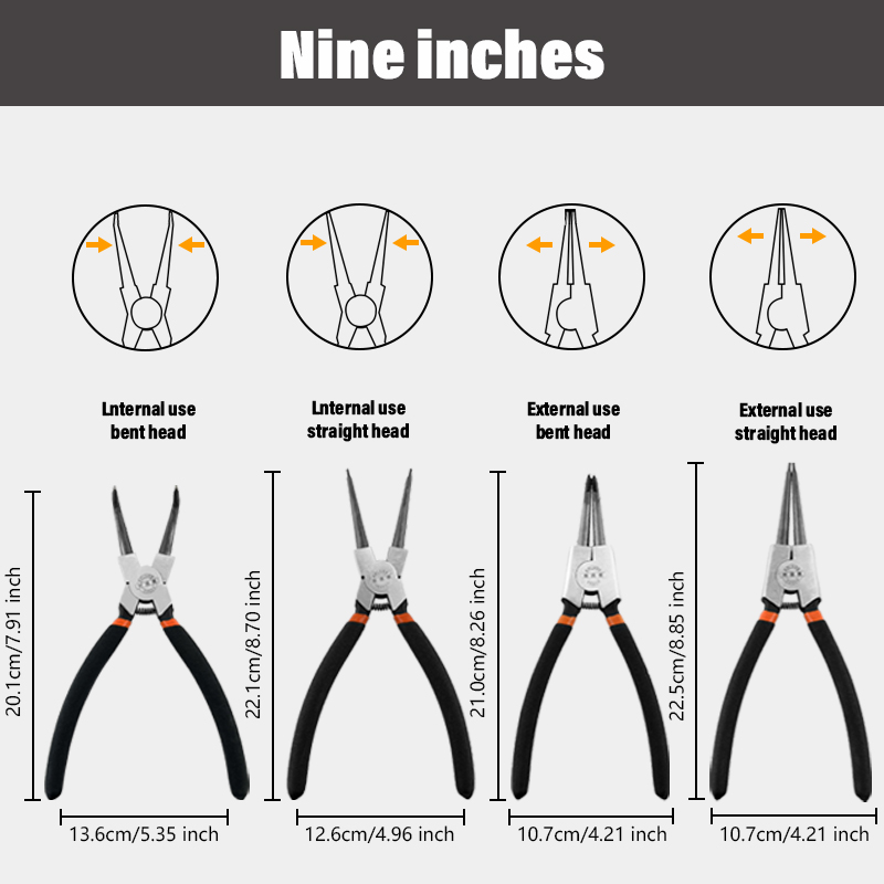 Purpose: Suitable for disassembling and installing snap springs in internal spaces. The design of the curved mouth facilitates flexible operation in narrow and angled spaces, and can accurately clamp the internal snap spring.